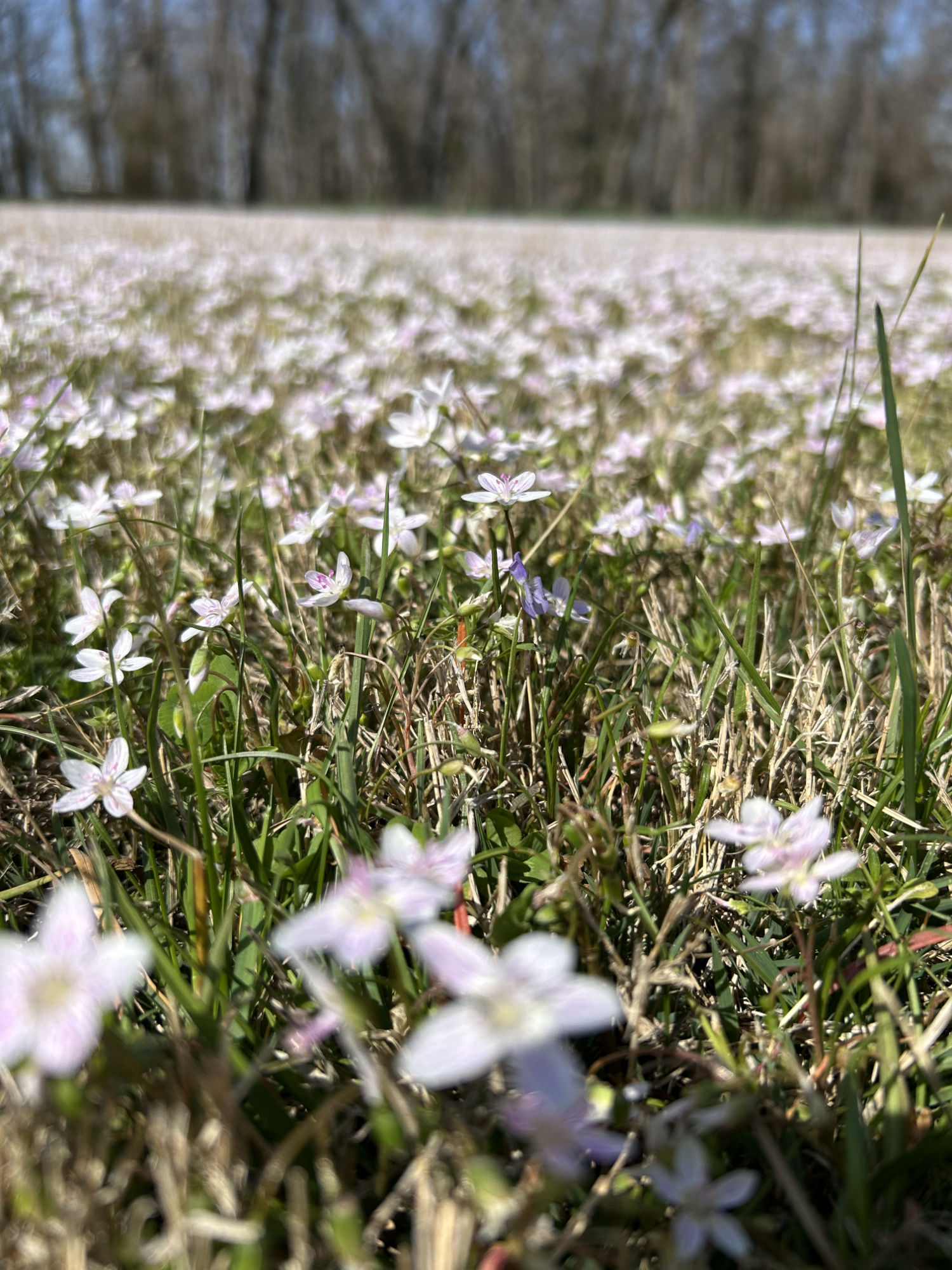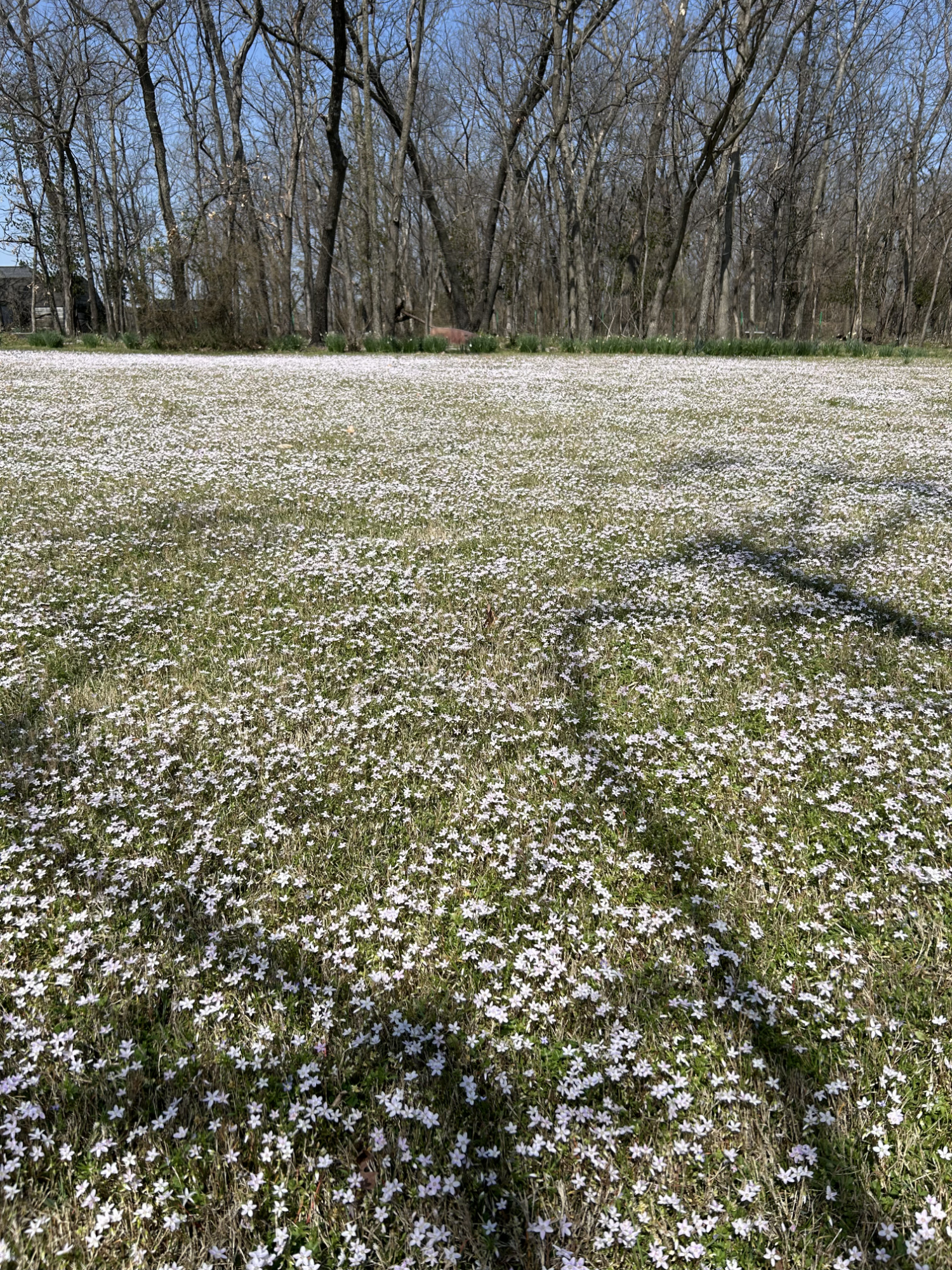 Because I have a big back yard that an extreme optimist would never ever call a lawn, tiny flowers from some sort of grass or weed pixelate it this time of year. I used to not want the yard mowed, even though the grass needed it, because tiny flowers covered the ground like a picnic quilt. When a breeze comes up, it causes a ripple effect, like “the wave” at a football game, changing the color by revealing the undersides of those tiny petals. Come to think of it, I haven’t seen “the wave” in a long time. Maybe it’s gone out of fashion because it takes a united effort, which seems to have gone out of fashion, too.