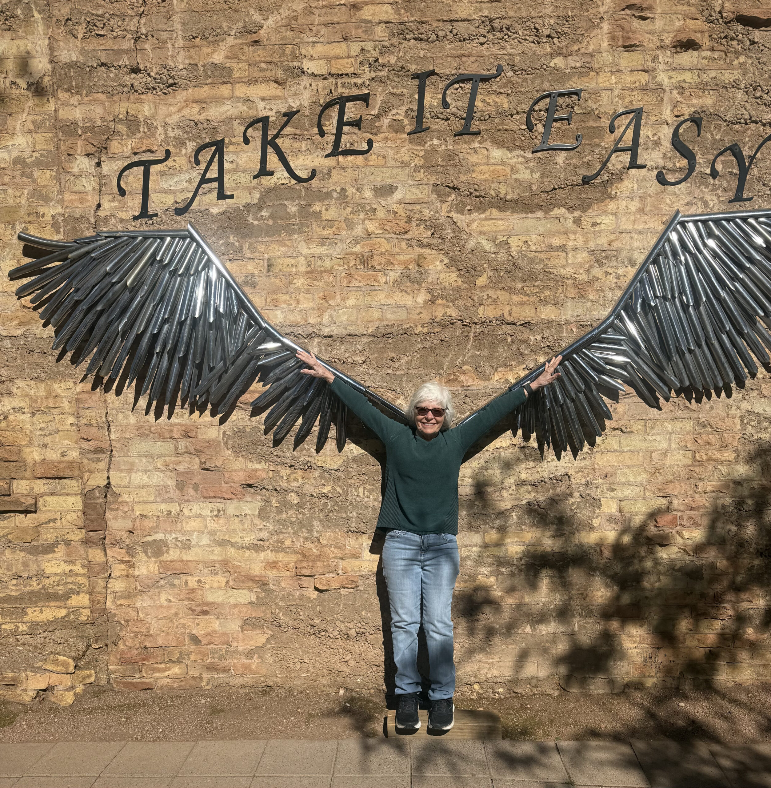 No Eagles fan could leave Winslow without standing on the corner for photo ops with the statues of Glenn Frey and the balladeer with his guitar. Strangers were kind to play photographer for each other at “Take it Easy” corner. We happened there early when the place had been spiffed up for the TV camera crew interviewing the mayor. Wandering in the background, we were surely the stars on the Phoenix news that night.
